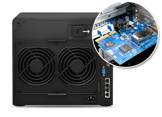 除了內(nèi)建的四個 Gigabit 網(wǎng)絡(luò)埠之外,DS3615xs 內(nèi)建一個 PCI Express 3.0 x8 插槽來安裝 10GbE 的網(wǎng)絡(luò)適配器 (NIC),藉以提升網(wǎng)絡(luò)聯(lián)機(jī)帶寬,為你存儲系統(tǒng)上需要處理大量數(shù)據(jù)的應(yīng)用程序提供優(yōu)越效能。此外,DS3615xs 內(nèi)建每秒 6Gb SATA III 介面支持,可將 SSD 的高速傳輸效能完整發(fā)揮,確保系統(tǒng)處理多項任務(wù)時,仍維持良好的傳輸效率。