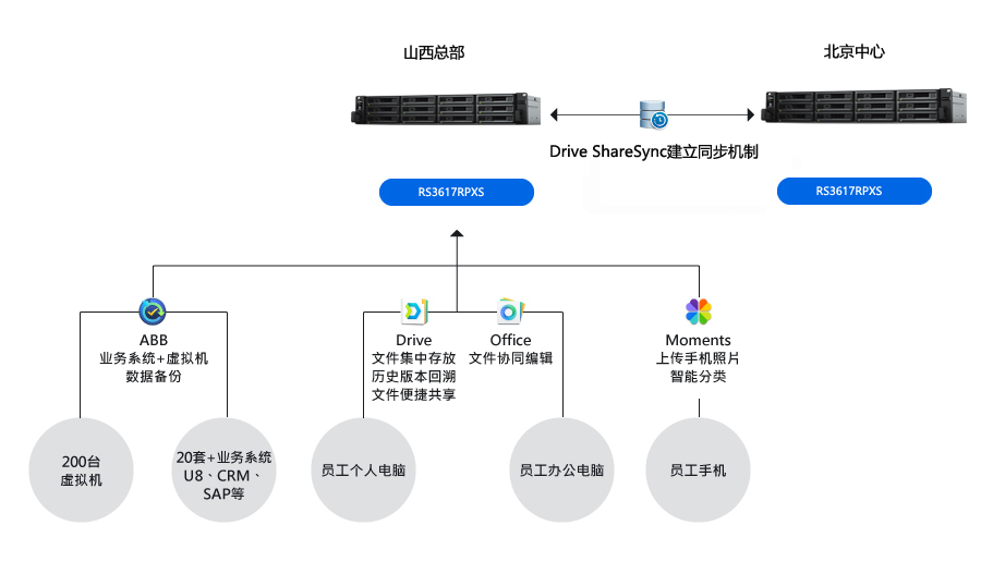 一份備份數(shù)據(jù)對公司的安全需求來說還不夠,借用群暉又進(jìn)一步打造了異地備份容災(zāi)方案。振東制藥山西總部的 RS3617RPXS 的備份數(shù)據(jù),通過群暉 Drive ShareSync多分點(diǎn)同步功能復(fù)制到北京分公司的 RS3617RPXS 中。支持排程備份計劃。