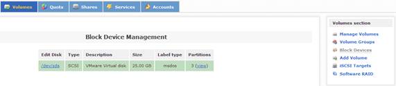 當配置好系統(tǒng)的安全訪問控制后,接下來的一步是配置系統(tǒng)磁盤,實現(xiàn)虛擬存儲服務(wù)。在 Openfiler 中,有三類存儲概念:Block Device,Physical Volume 和 Volume Group。其中,Block Device 表示的是實際的物理磁盤;Physical Volume 表示的是物理磁盤的分區(qū),它是組成 Volume Group 的單元;Volume Group 則是由一個或多個物理磁盤分區(qū)(Physical Volume)組成,它又是組成 Logical Volume 的單元。